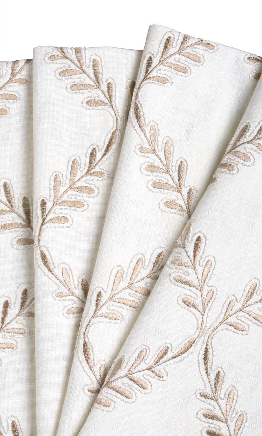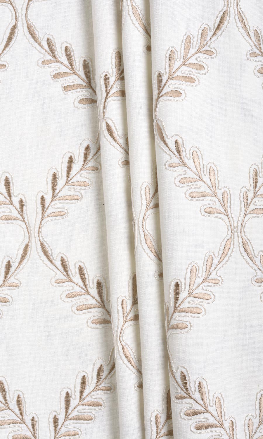 Those who love geometric patterns as passionately as floral designs can now gratify their design aspirations in this linen-blend. Slender sprigs move rhythmically from top to bottom caving in at intervals to form a harlequin pattern. Window treatments in this white fabric with brown embroidery make a gorgeous visual treat with subtle contrasts.