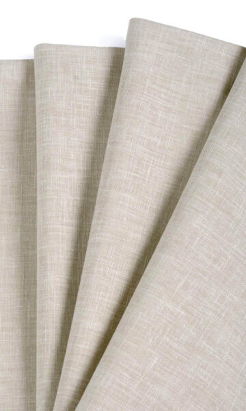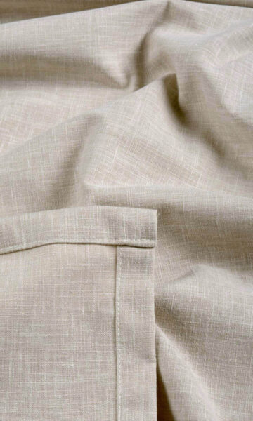 Like to fill your home with soft earthy tones that can melt any soul? Window treatments in this greige drapery fabric are both captivating and restful to the eye. Merging the moisture-wicking capacity of cotton with the stain resistance of man-made yarns, this cotton blend fabric is a smart choice for a busy home. Pinched pleats drapes, front-slatted shades, and relaxed roman shades that offer their very structure as the element of visual interest are especially well-suited for this solid-colored fabric.