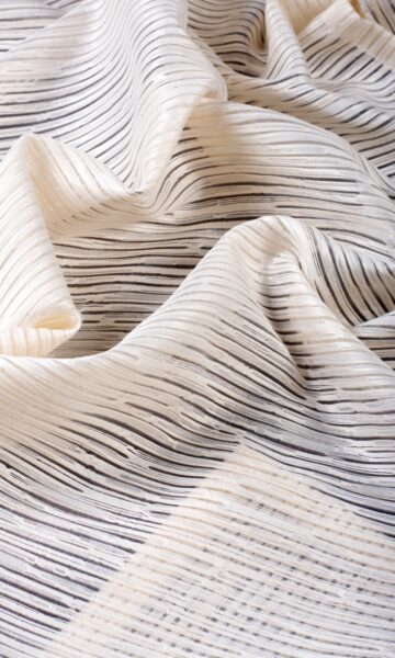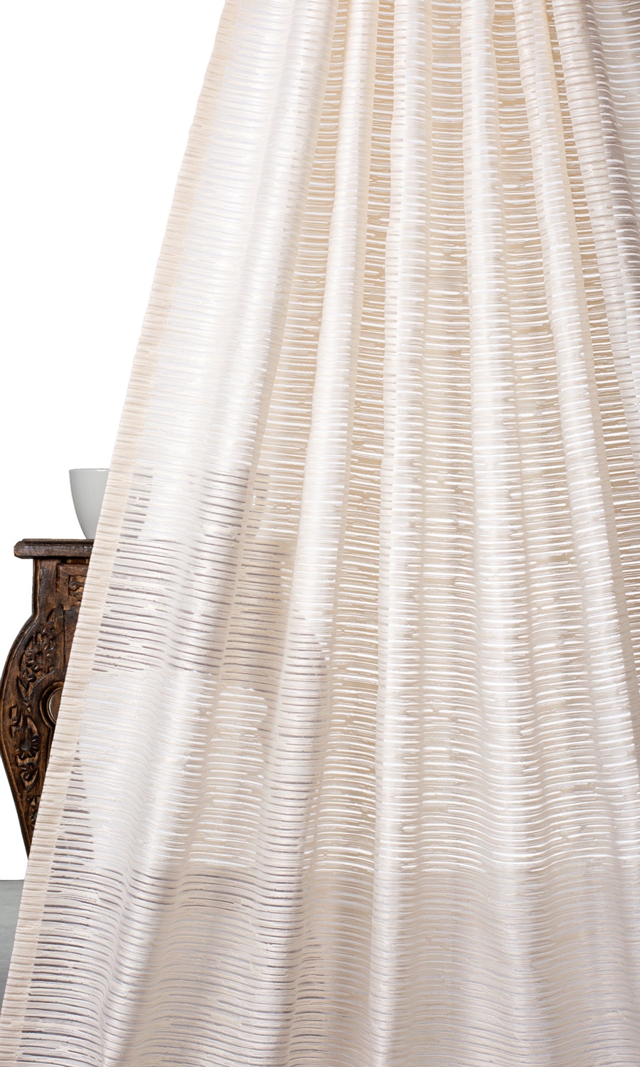 A warm ivory / beige sheer with a unique personality! Striated horizontal stripes with raised texture and devore-like finish make this delicate sheer truly special and promise dramatic shadows besides the warm glow. A timeless addition to any space, Snowpea can team up with any color, pattern, and decor style. Ensure daytime privacy in your bedroom while pairing with blackouts for insulated coverage. Or, use as a standalone in non-private rooms to welcome diffused light.