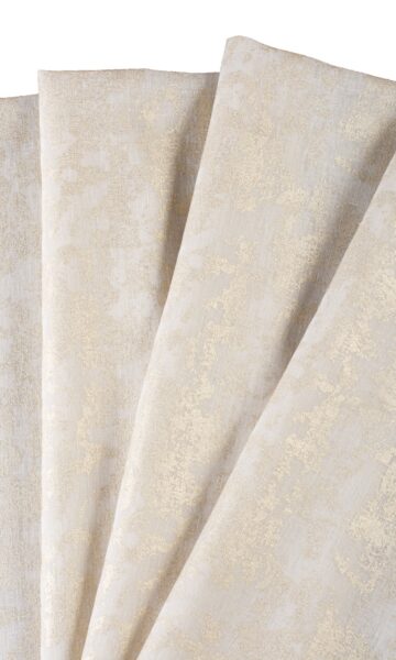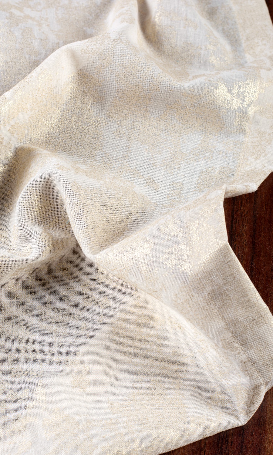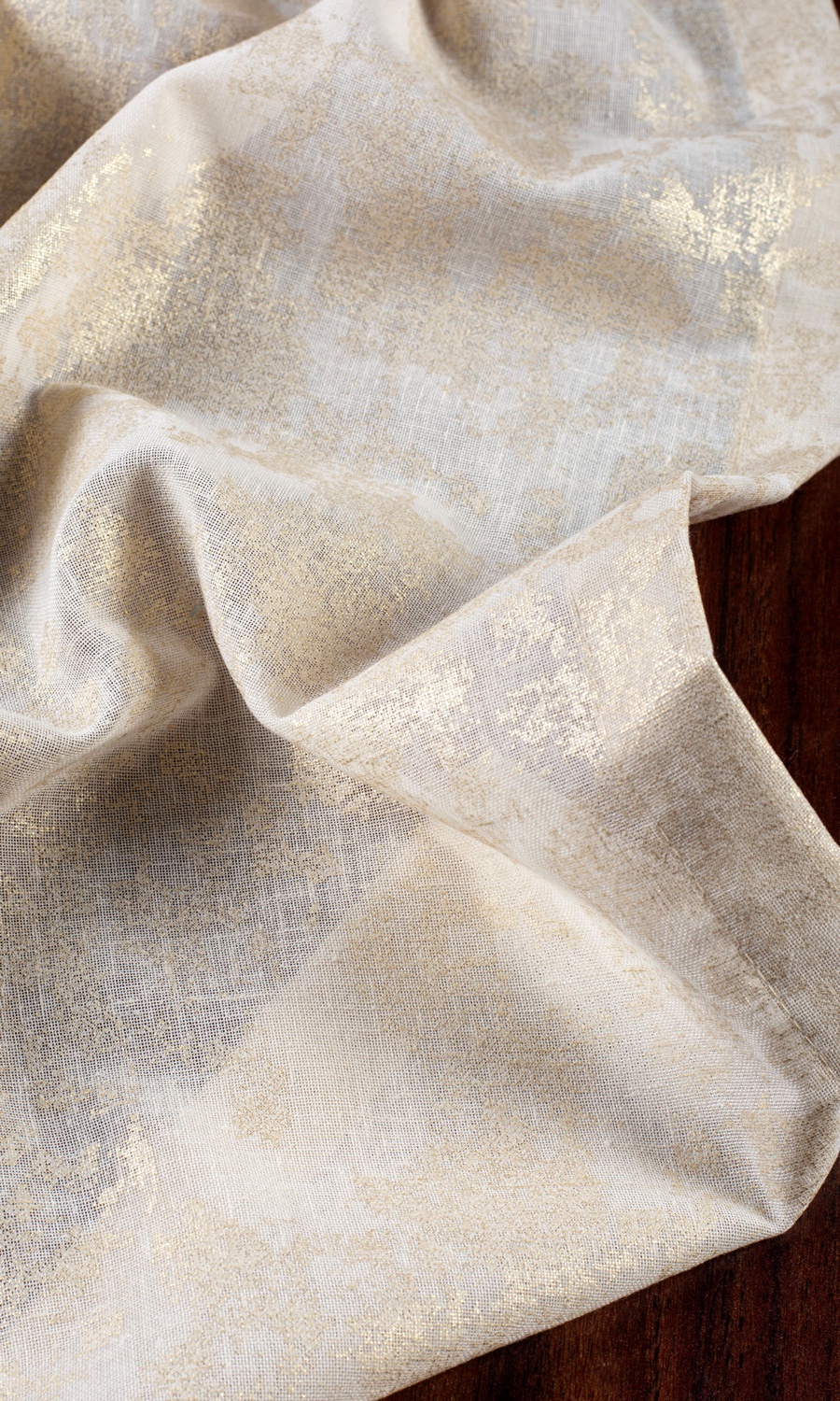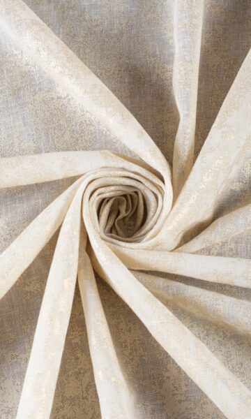 This exuberant semi-sheer fabric is just the right bit of glam you need to finish a formal living room or a Bohemian haven fraught with jewel tones. Its soft cream broken only by the slubs of its weave and the golden accents of its abstract print offers a modern pattern in a tried-and-true regal palette that never goes out of style. So, you can welcome light during the day and let it glitter under your chandeliers at night offering a fiesta of golden light and stately elegance.
