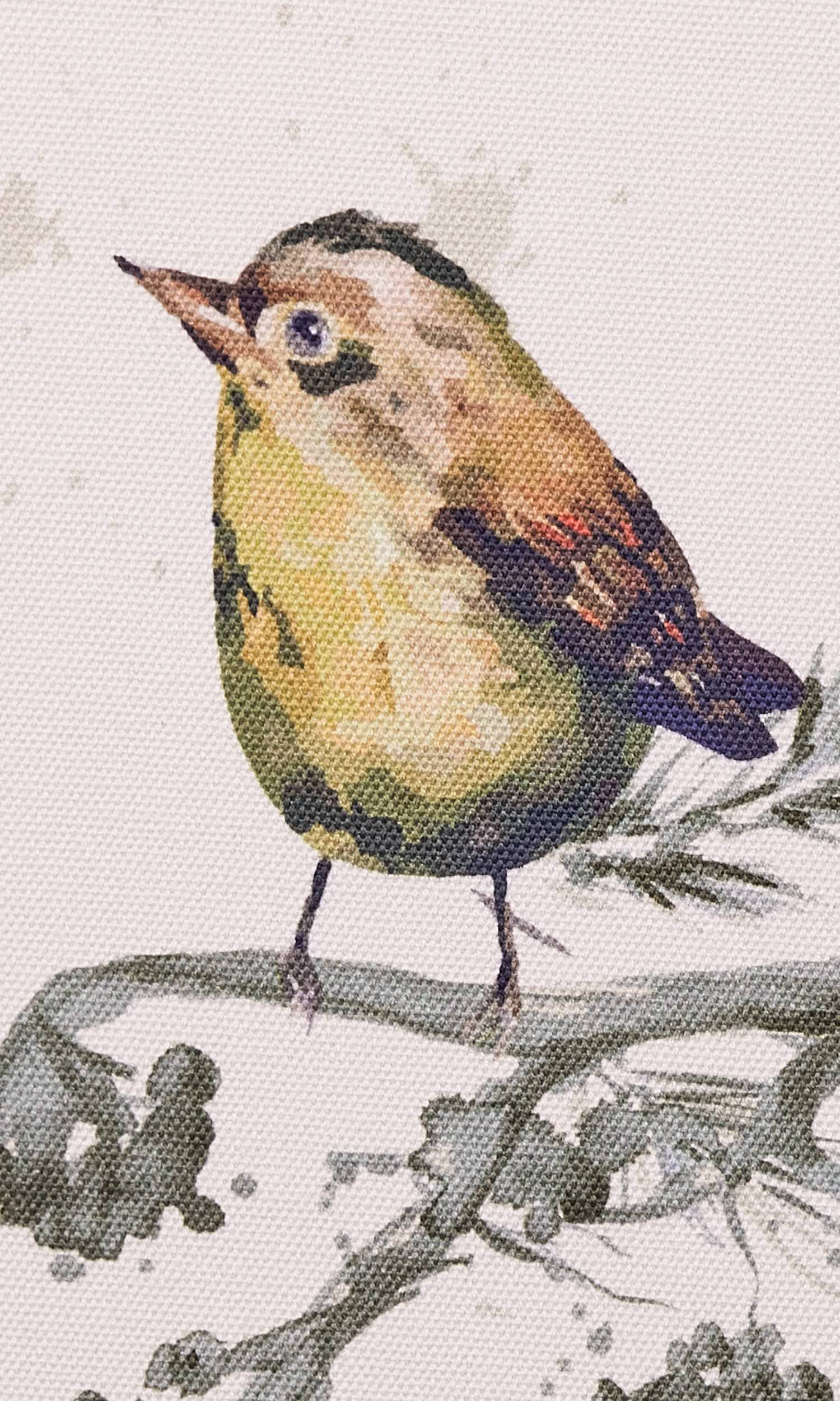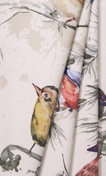 This beautiful bird print fabric features a garden-inspired design with wild lark birds, branches and blooms. Its pure white backdrop is brightened with a vibrant color palette of red, gray, beige and blue. A cheerful choice for nurseries or any informal space.