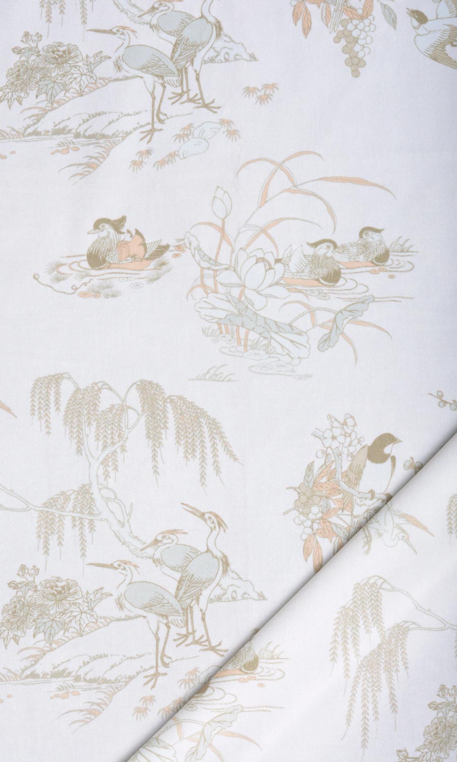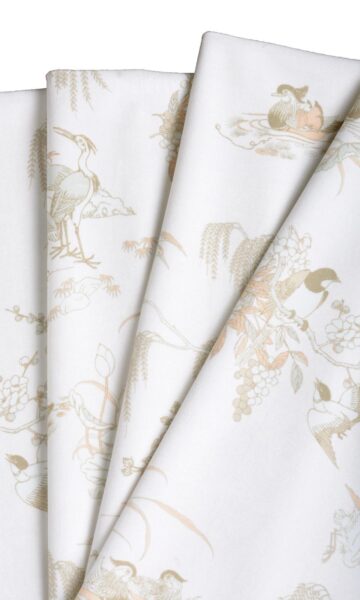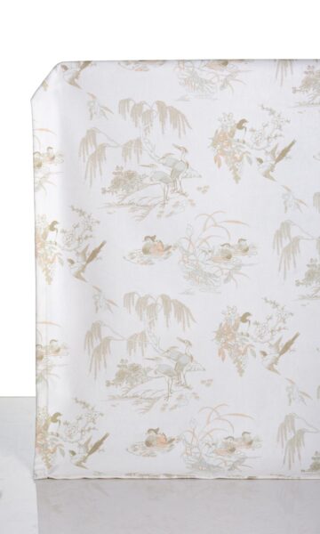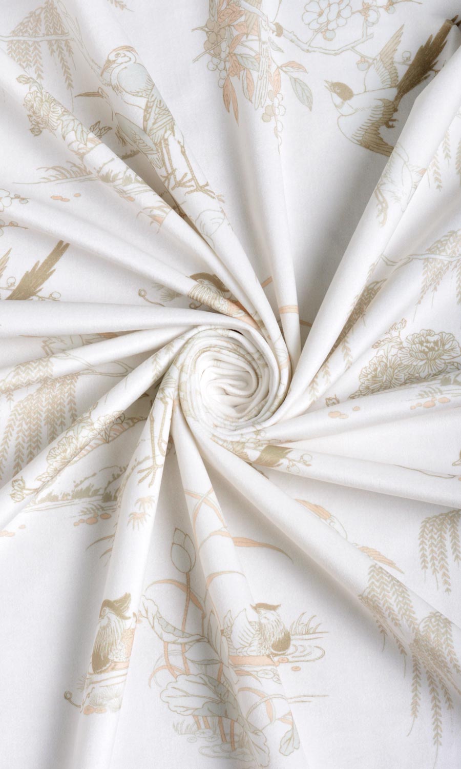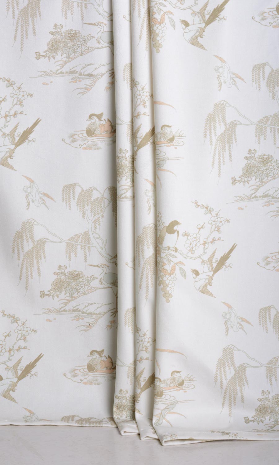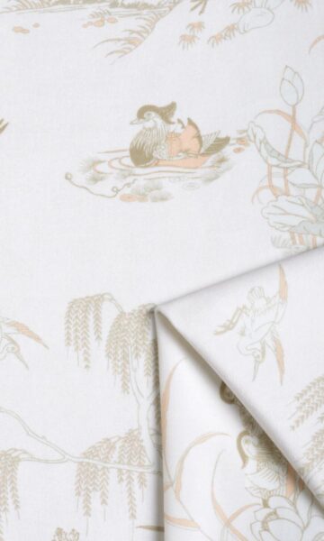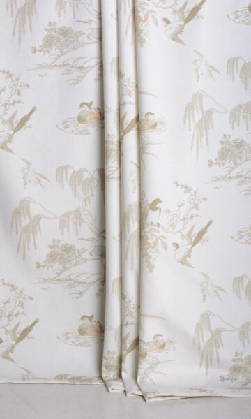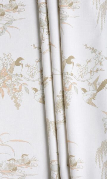 Toile and chinoiserie fuse together in a neutral color palette that can blend beautifully with any decor style. Picturesquely framing the daily events of our feathered friends in brown ink on an ivory velvet backdrop, this window treatment offers a visual treat for nature-lovers. With just a wee bit of blush pink and soft grey, the classic motif is fine-finished on a sophisticated note by the plushness of its velvet base. Floral wallpaper fans can test the waters with drapes and roman shades in this charming fabric.