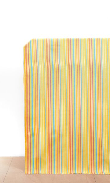 A cheerful cotton fabric featuring a deep hue of yellow interlaced with colorful stripes of blue, white, orange and purple.