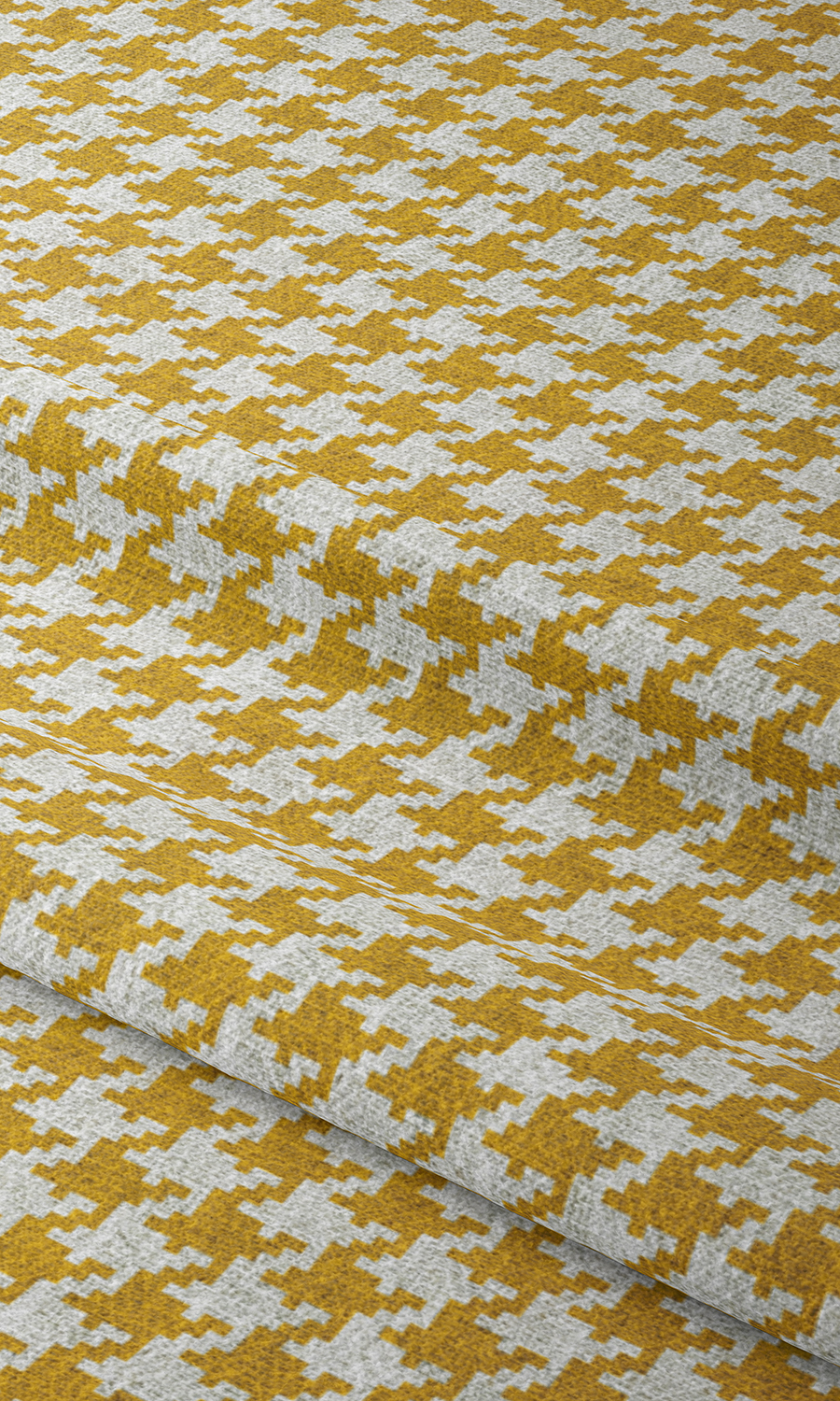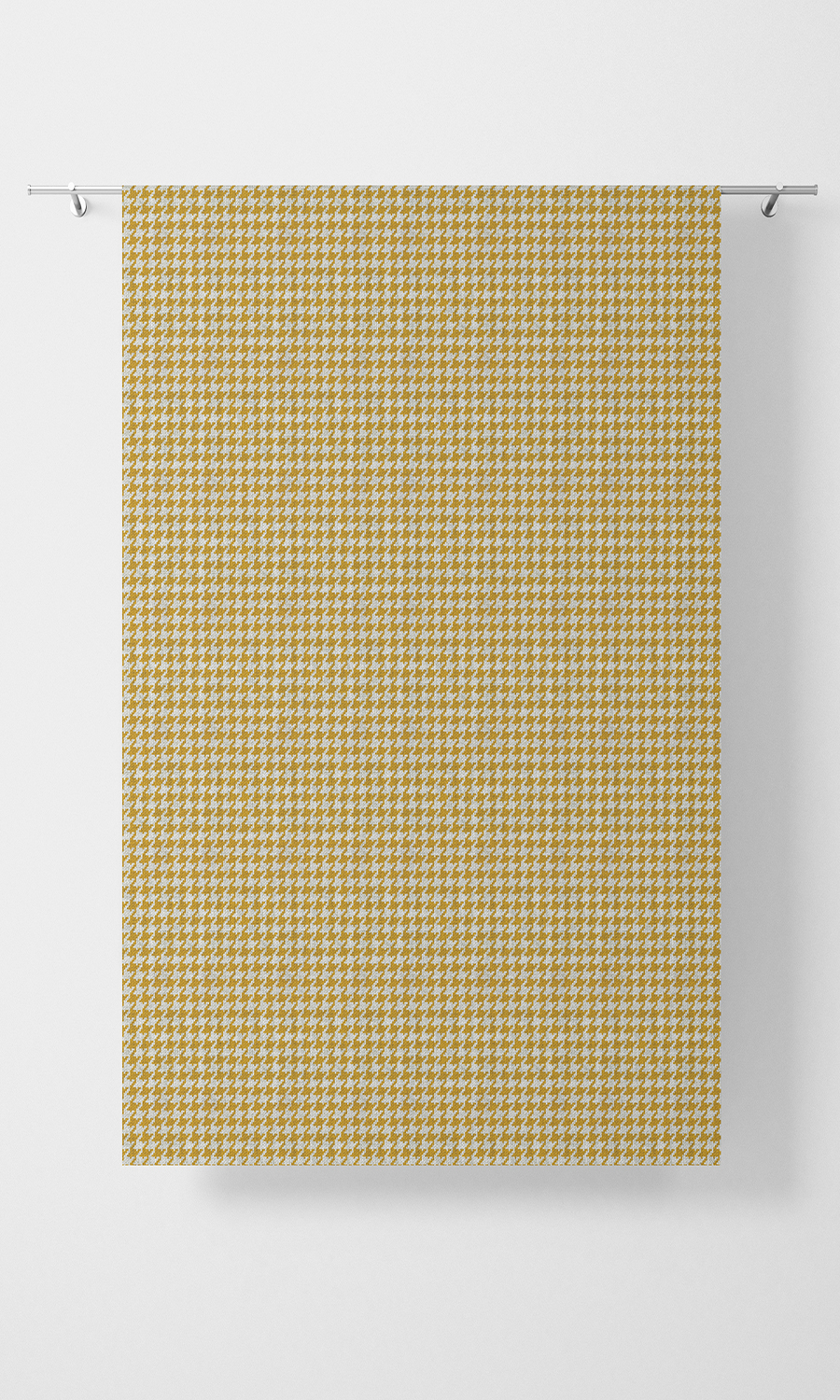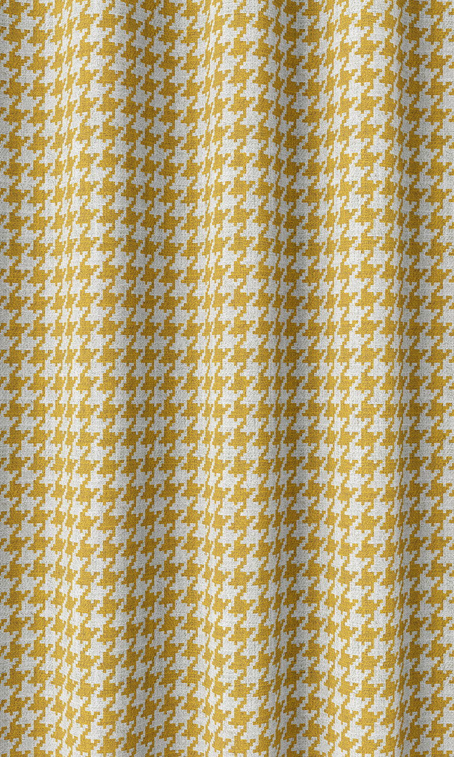 Featuring traditional weaves in a classic color scheme. This herringbone weave fabric has houndstooth checks woven in sunflower yellow and white. Cheerful in appearance, warm in ambience and smooth in drape, this fabric has everything you want in your window treatments fabric.
