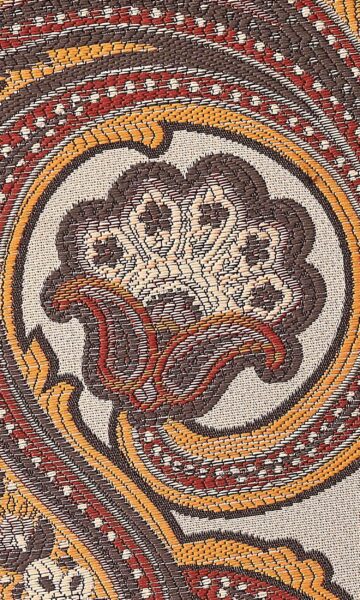 This ornate fabric has been intricately jacquard woven with a profusion of paisleys and blooms inspired by temple art of India. The rich earthen tones of burnt umber brown, russet red and deep yellow on a white backdrop evoke a warm and welcoming aura.