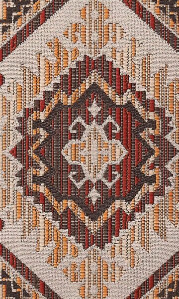 This eye catching fabric has been jacquard woven in a stunning Aztec inspired pattern. The intricate weave in earthen palette of burnt umber brown, russet red and deep yellow on a white background creates a splendid visual effect. Perfect for formal spaces!