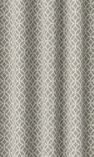 Featuring an intricate pattern of circles with inset diamonds, this geometric patterned fabric looks stunning in a greige and white palette. Curvy features of the pattern contrasting the straight finishes of other decor elements in the room will offer a visually impressive counterbalance. Moderate scaling lends this fabric the versatility to adorn rooms of any size. Window treatments in its soft and muted palette will blend easily with decor styles that employ light and bright hues. Stylist Tip: Layered with white sheers, the white accents of this fabric will stand to make a bigger visual impact.