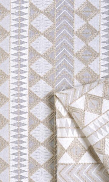 Blending traditional embroidery with a contemporary color palette in white, gray and beige. The basic fabric is the palest gray that’s covered with an embroidered geometric pattern rich in straight lines, triangles and angles. While most of the embroidery is white, it has been highlighted in beige to resemble the traditional kantha embroidery from India. To sum it up; Tipari is a cut above the rest.
