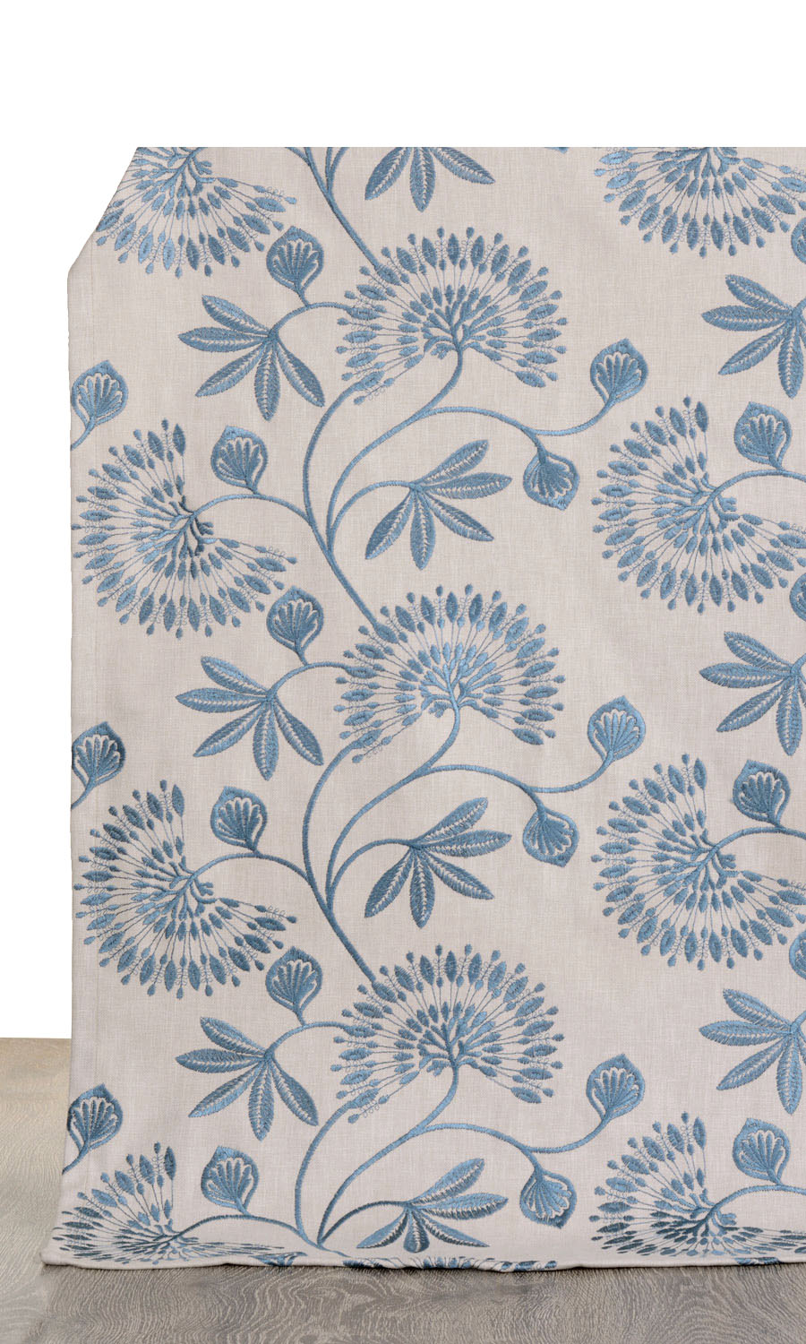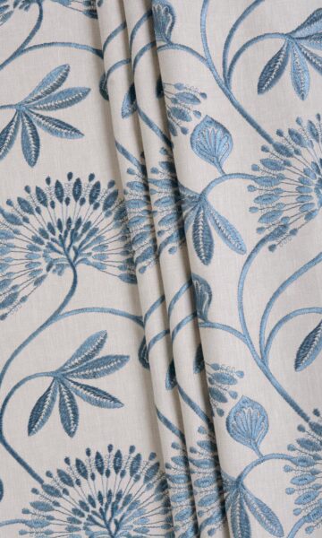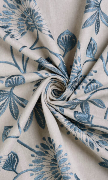 Floral fantasy of a fabric. Its very pale beige surface is embroidered in ocean blue with a gorgeous floral pattern full of vines, leaves, fan-like flowers and buds. The slightly glossy threadworm gives a glamorous feel. Ornate without being over-the-top, Tiszta is a terrific choice for a tasteful interior.