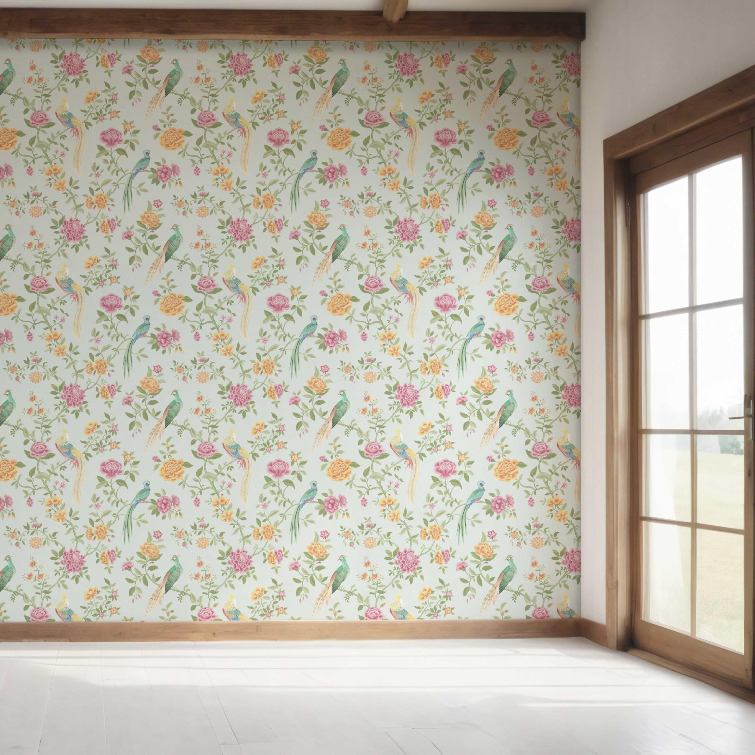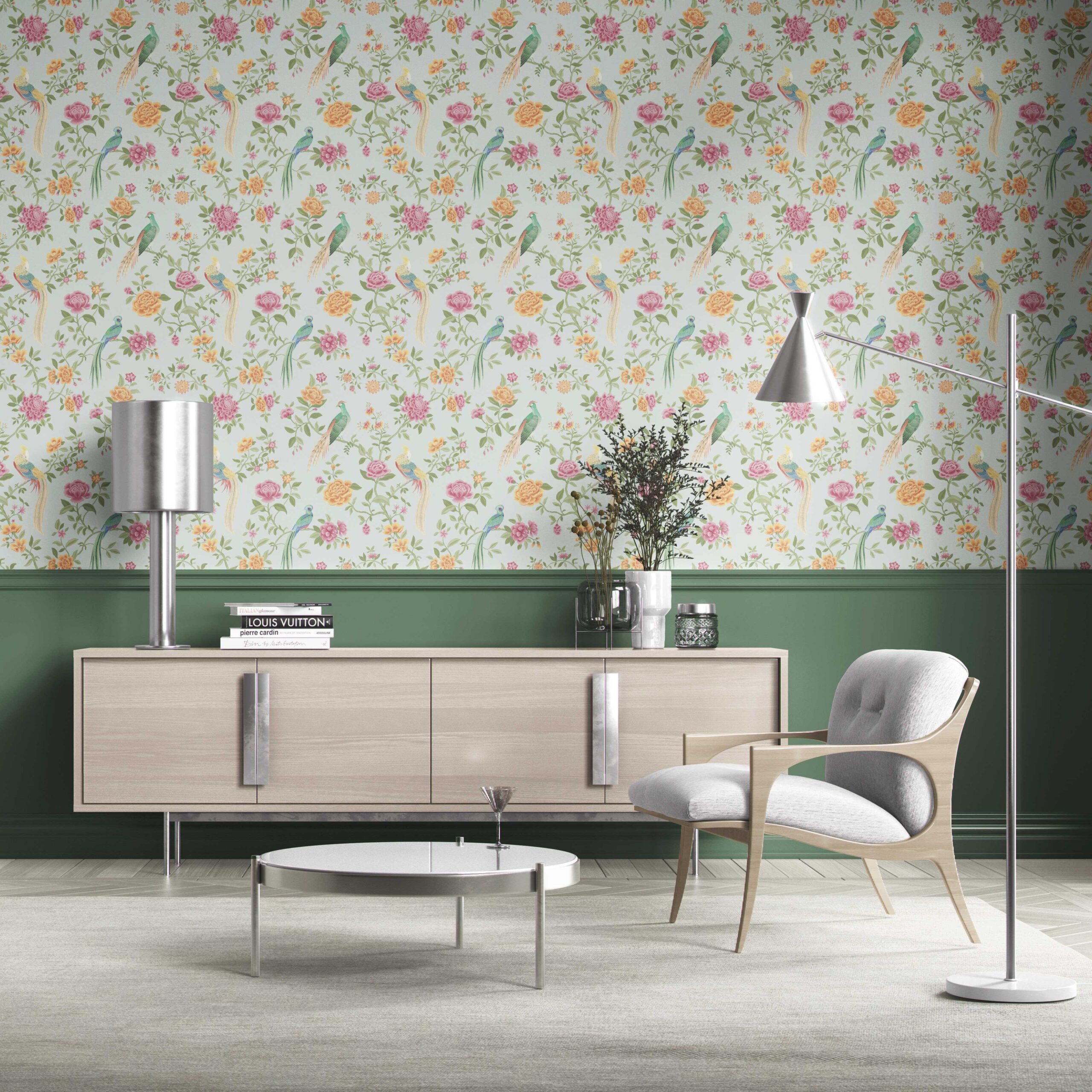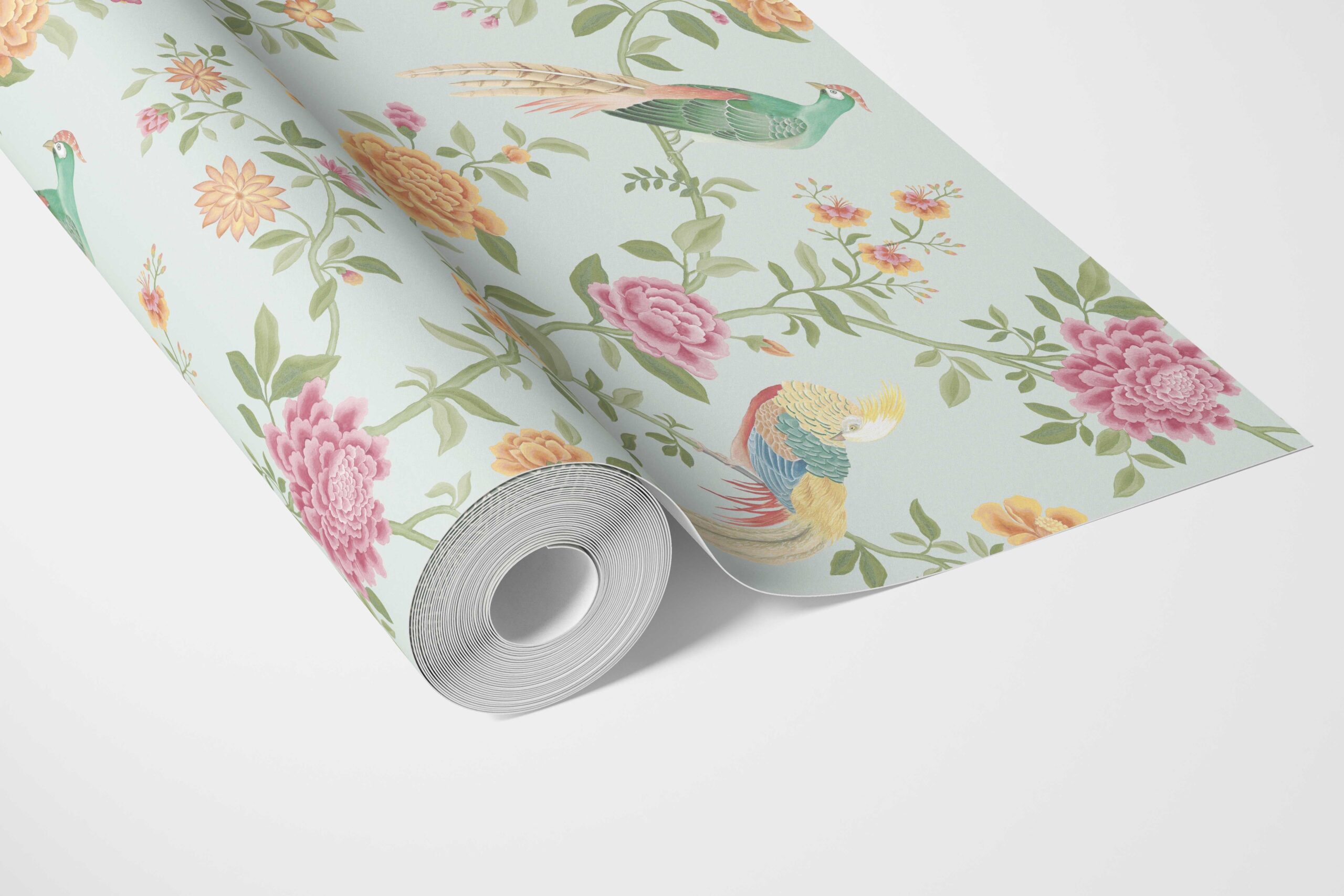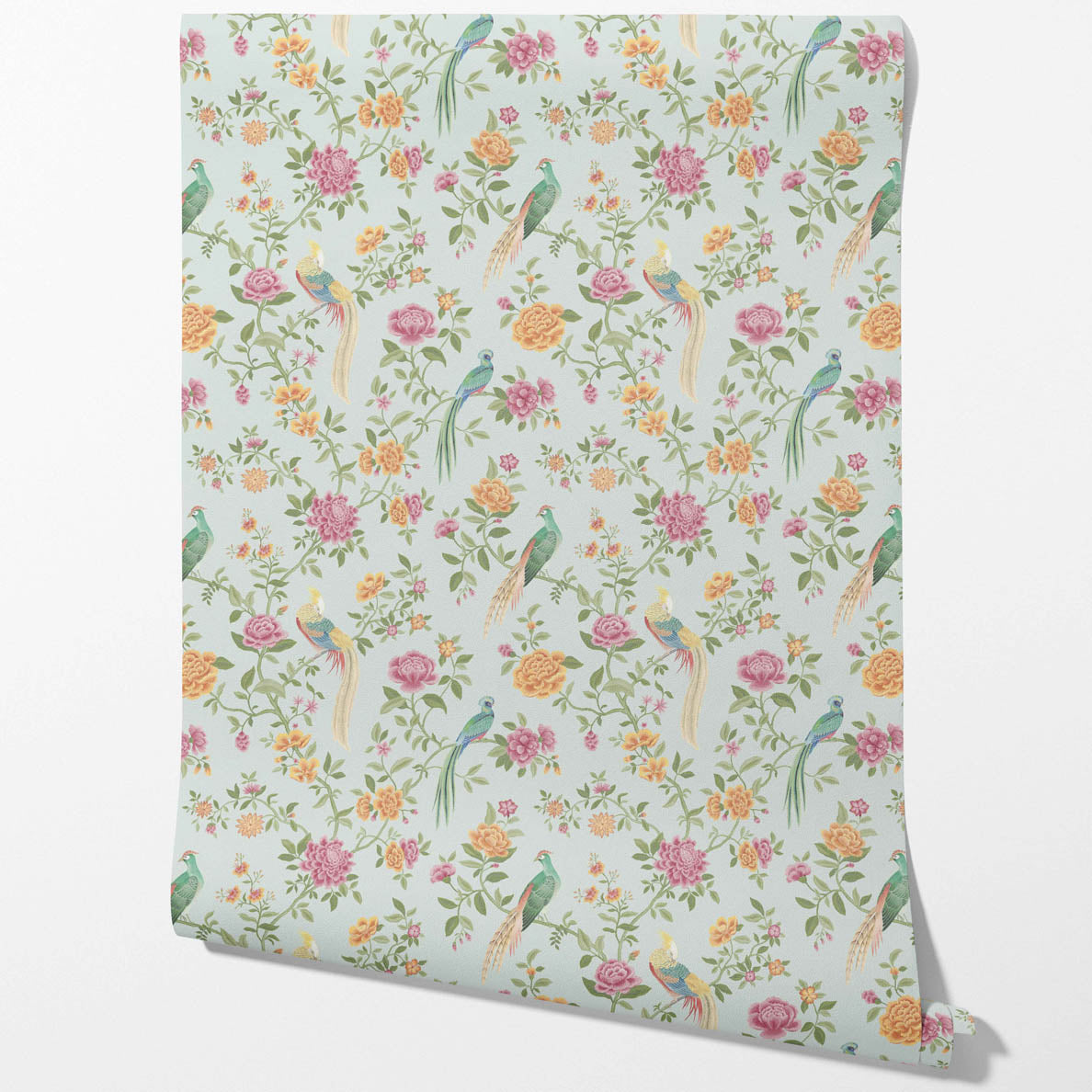 ‘Toucans’ Floral Chinoiserie/ Nature Bird Print Wallpaper (Duck Egg Blue/ Pink/ Green/ Yellow)