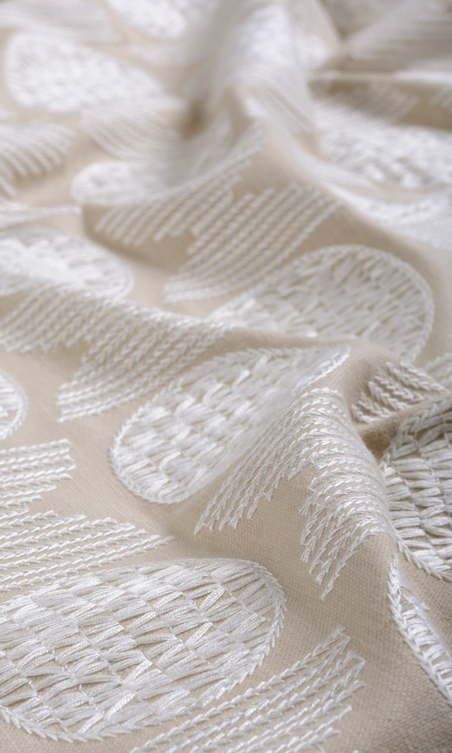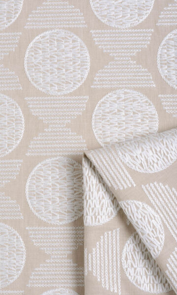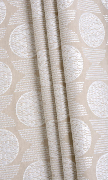 Geometry transforms into refined harmony. This beautiful beige fabric has been embroidered in white thread with circles and half circles motifs placed alternately. The look is understated yet elegant. A good choice for those who like the neutral look with a touch of decorativeness in their decor.