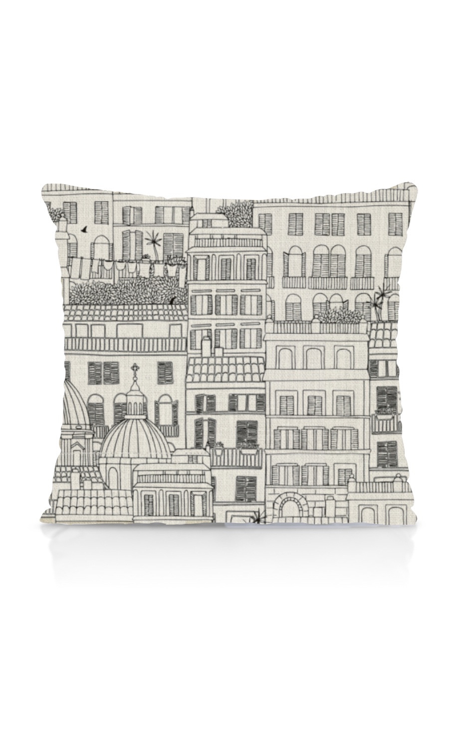 A celebration of city life, this flatweave fabric features a minimalist architectural aesthetic that brims with urban charm. Its simplistic building illustrations are complemented by renderings of potted plants, terraces, and laundry hung to dry on the line. Cheerfully stylistic, this fabric will bring a whimsical nuance to your kitchen, dining room, or living room. It also features perfectly neutral shades of black and white that promote pairing ease with virtually any color scheme.