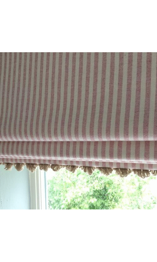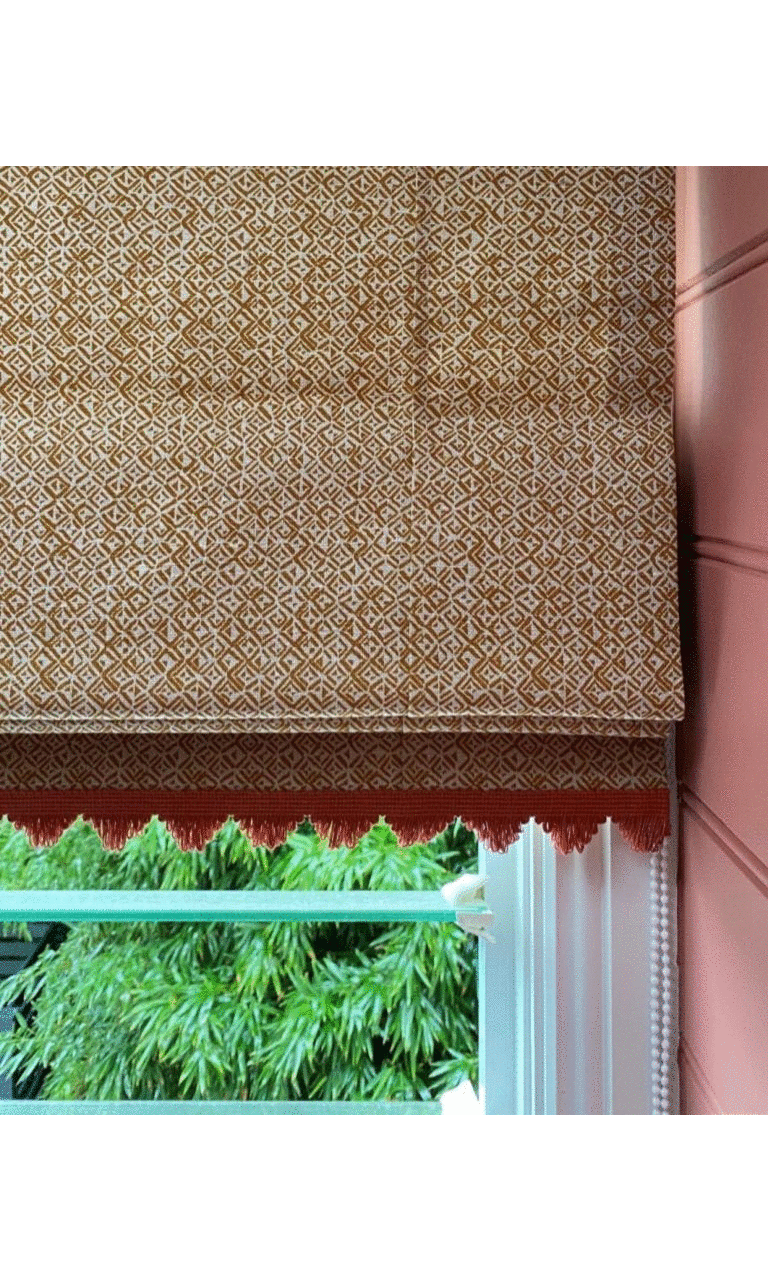 Fan edge trims are handsewn on bottom hems of roman shades for a delightful effect.