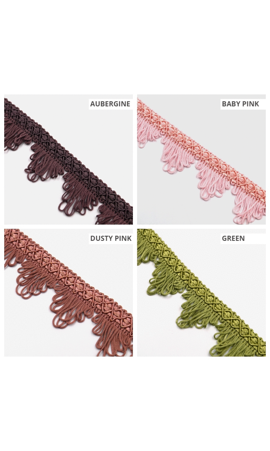 Perfect for both curtains and roman shades, and with 8 colours available, you’re bound to find one that suits your style. The loop fringe on these braids is soft, 100% cotton, and the finished trimming width is 35 mms from the edge of the braid.
