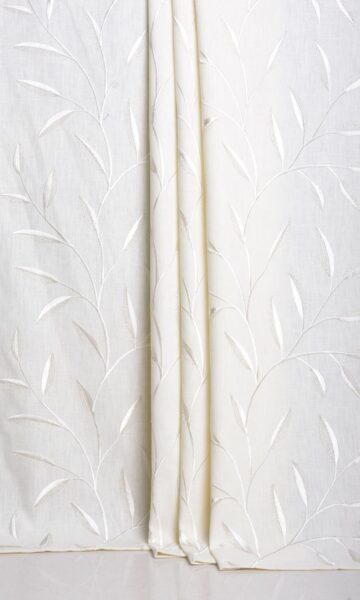 For those who want a dainty detail over their plain white window treatments, this tone-on-tone drapery fabric spells the end of the hunt. This warm white linen-blend delicately embroidered with cream sprigs all over is an understated beauty. Curtains and roman shades in ?Virgin Lace? win hearts with their chic sophistication, subtle contrasts, and nature-inspired pattern.
