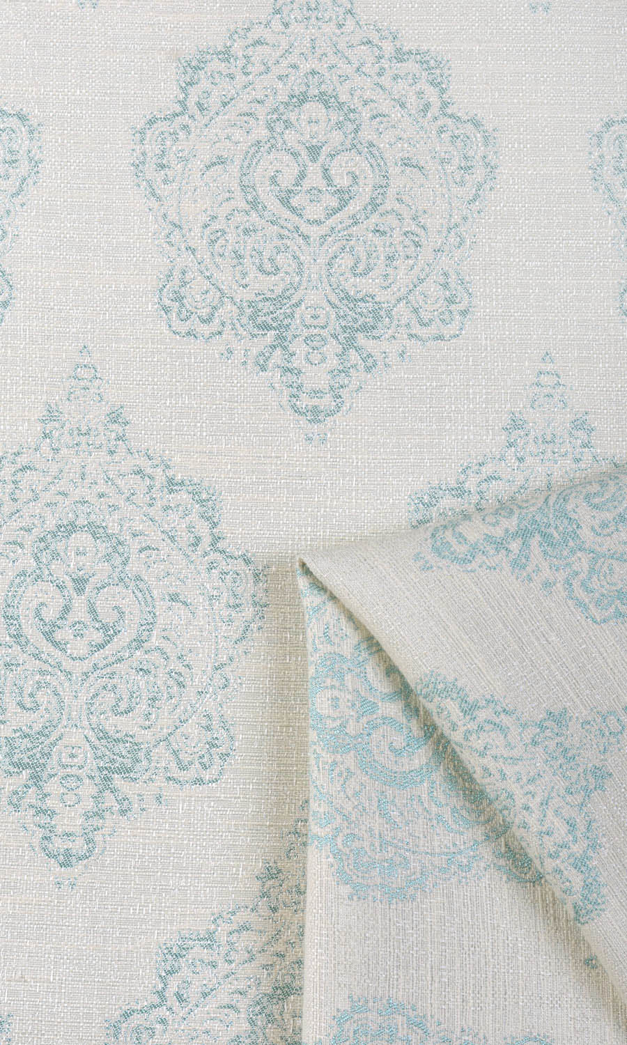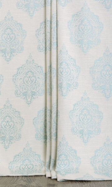If you like traditional jacquard motifs but dislike intense color palettes and overly ornate design elements, Wasser should appeal to you. This sturdy polycot drapery fabric has an off-white base patterned with a traditional, oversized and stylized botanical motif in a delightful blue. The texturally rich base and the raised pattern look good together; as does the simple no-fuss color combination.