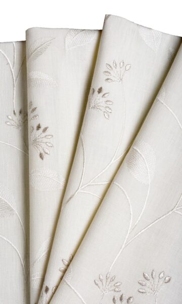 Speaking more with few words, this cream drapery fabric presents floral motifs with subtle contrasts and artistic finesse. Leaves and blooms on slender stalks, embroidered delicately in tones of white, give off the sophisticated flair of the nature theme impressively. The neutral palette ensures easy blending with diverse color schemes and decor styles.
