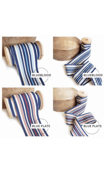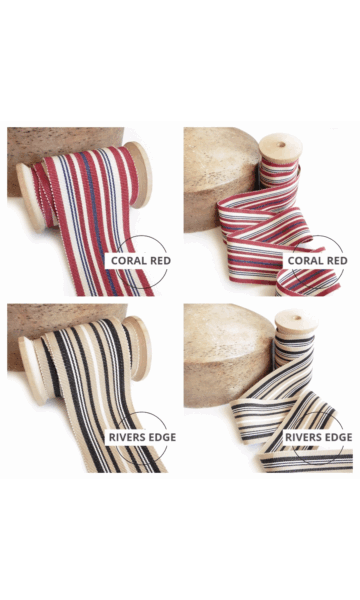 This lovely ribbon trim is not only extra wide at 54 mm, but it’s striped as well! With the coveted picot edge, it is designed to lend a perfect finishing touch on your roman shades from Spiffy Spools. Trims in this collection are 100% cotton, available in four colorways and come to us all the way from France.