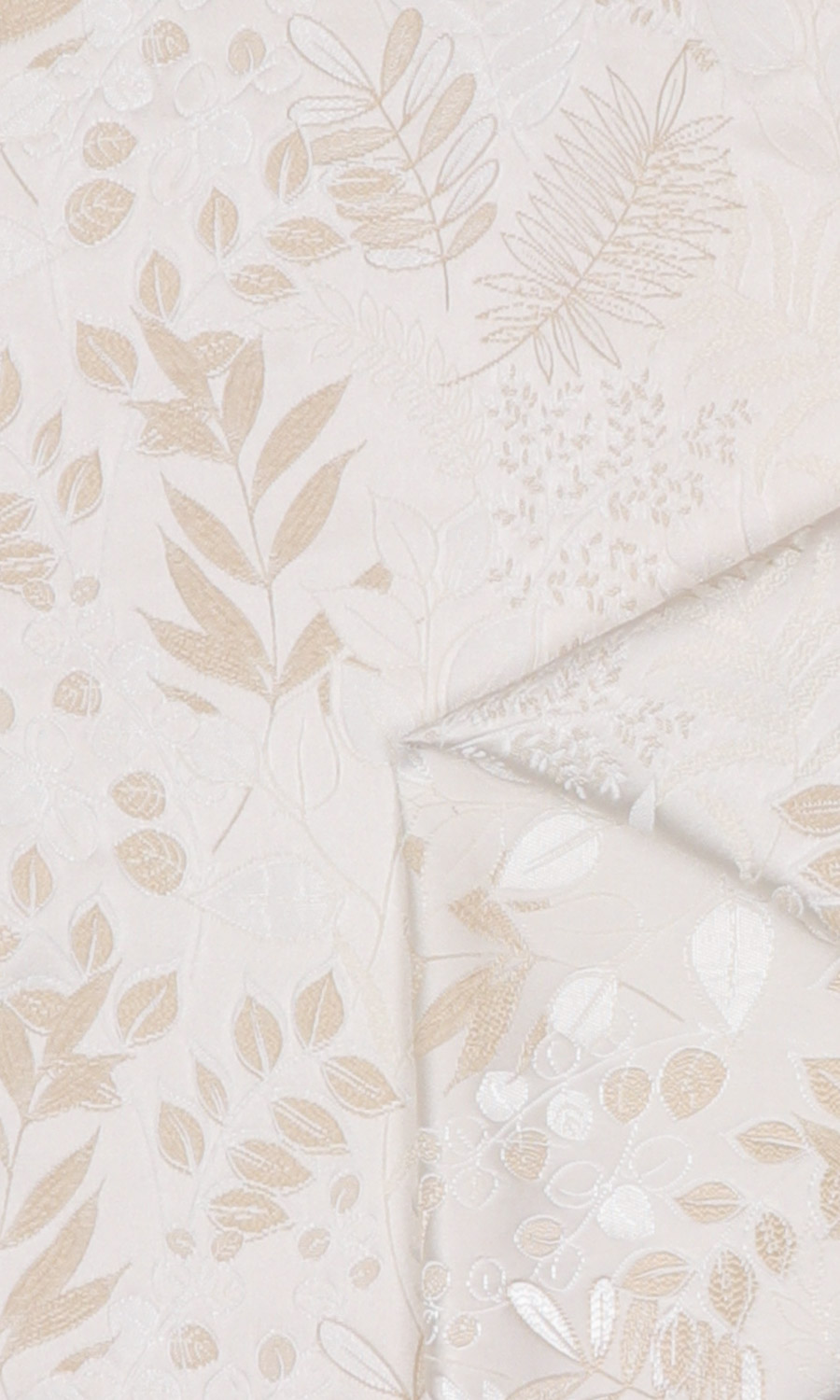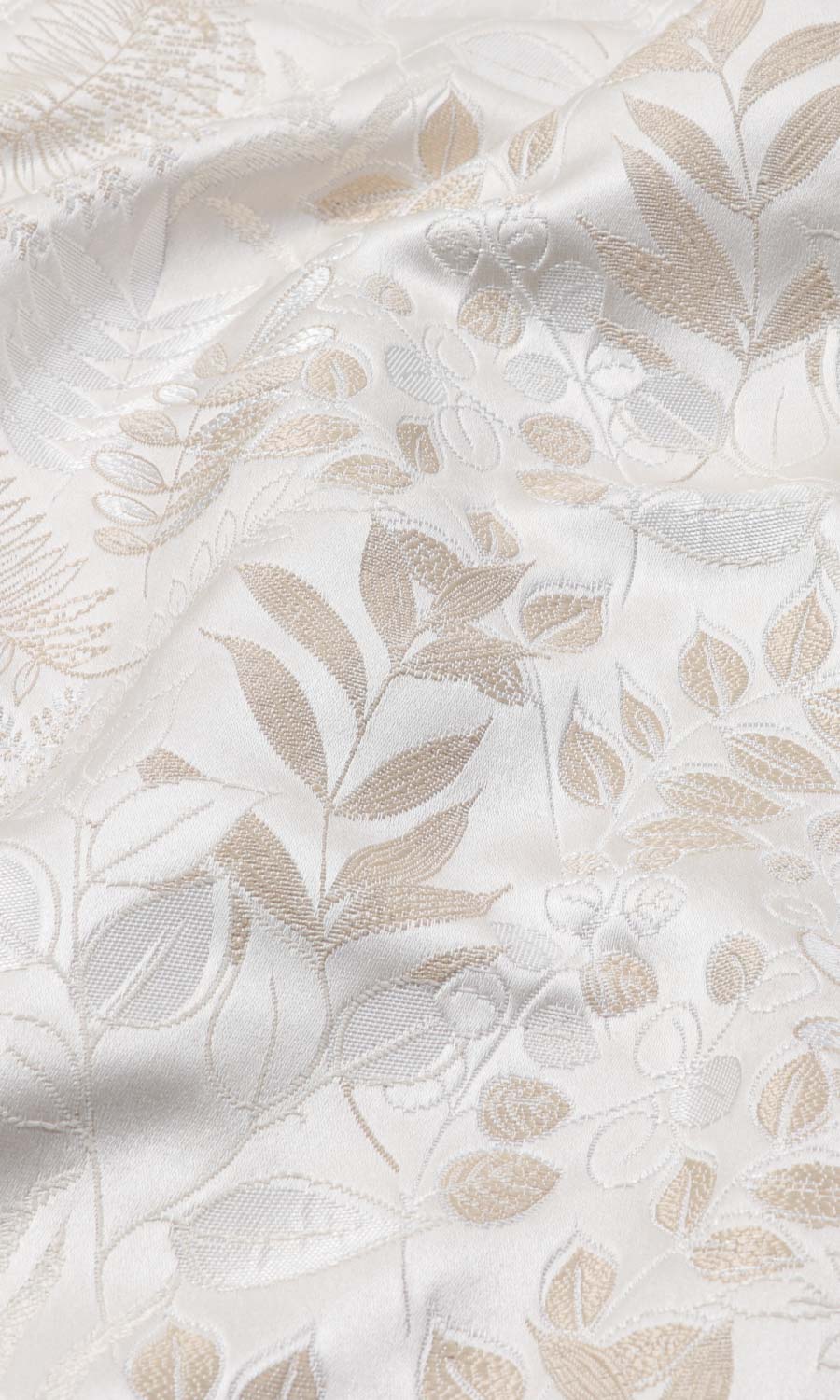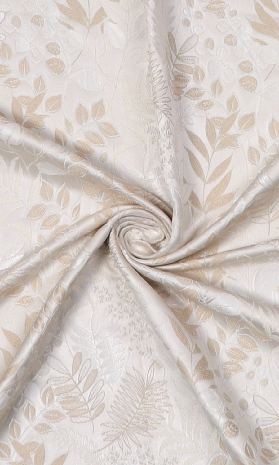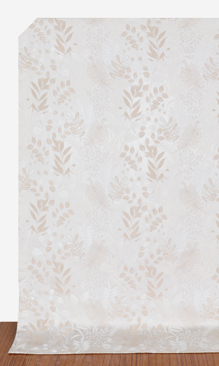 Botanical prints in quiet colors and a gentle sheen. Bring nature-inspired themes to your decor with Wisteria’s intricately detailed leaf prints in a soothing white-ivory palette. Its vertical layout draws the eye upward, making it a great choice for low-ceiling rooms to create the optical illusion of a taller window and higher ceiling.