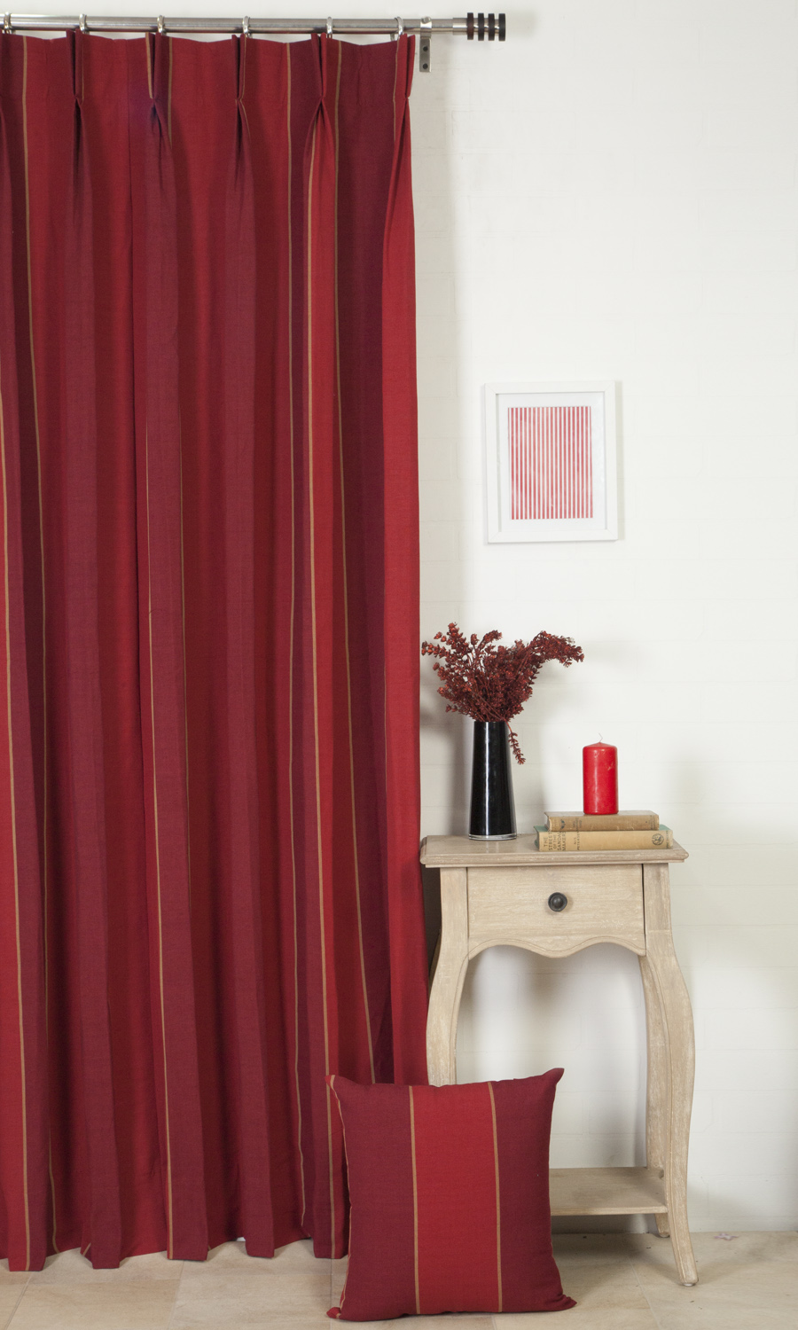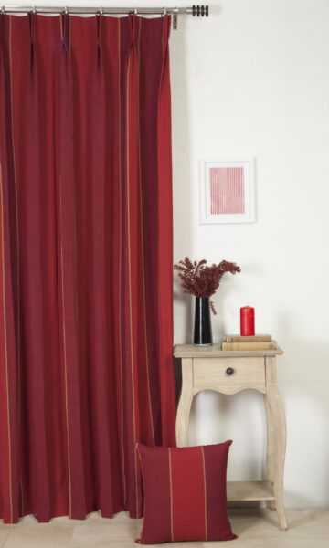 Part of our swoon-worthy cotton collection, Yamini Souk features a vertical woven stripe with plenty of interest. With a raw, softly tactile feel and its body of warm tones of red, Souk feels like a modern take on cotton, so cozy and full of flavor. This medium weight cotton falls beautifully and never fails to impress – no matter what the heading style – from the fullness of pinch pleats to the minimalist look of the eyelet heading.