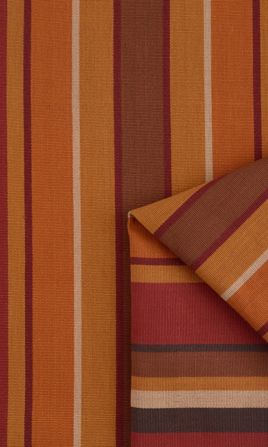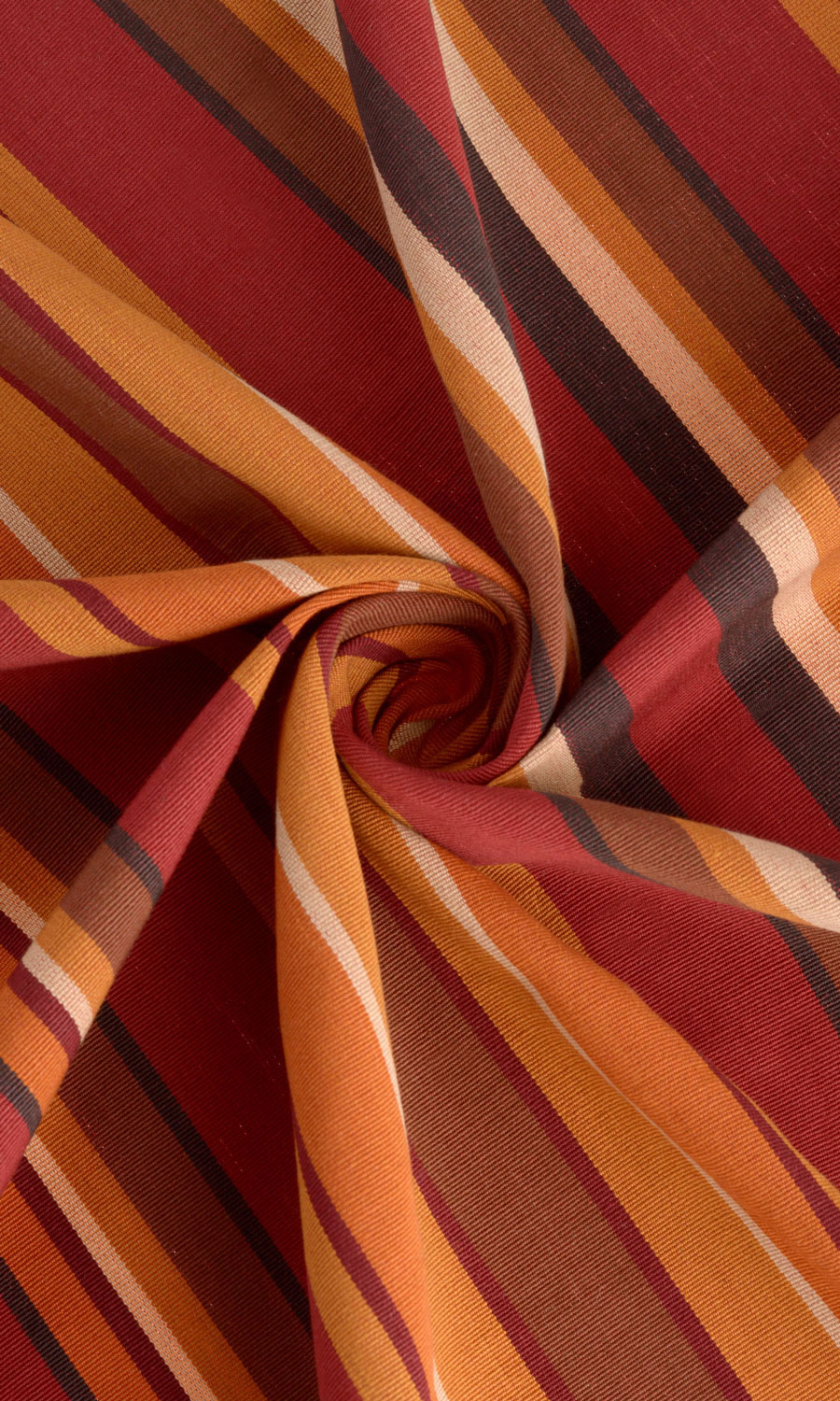 Part of our swoon-worthy cotton collection, Yamini Suhum features a vertical woven stripe inspired by the African sunset. The pattern holds plenty of interest as does the palette. With a raw, softly tactile feel and its body of warm tones of red, brown and yellow, Suhum feels like a modern take on cotton, so cozy and full of flavor. This medium weight cotton falls beautifully and never fails to impress – no matter what the heading style – from the fullness of pinch pleats to the minimalist look of an eyelet heading.