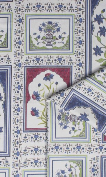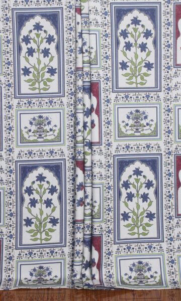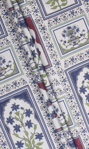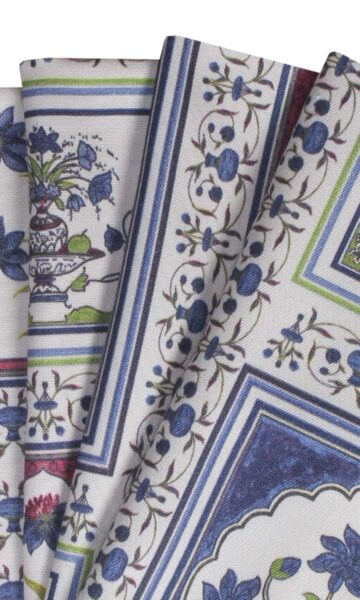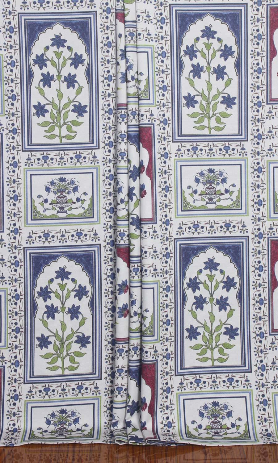 Oriental theme in a classic color scheme. Zaint offers a sneak peek into India’s extravagantly detailed art forms and architectural marvels. It combines the florid beauty of Mughal-style hand-painted floral designs and intricately embellished ‘jharokhas’ – the ornate oriel windows of classical Indian architecture. Add an eclectic dimension to your decor with window treatments crafted from this exotic cotton fabric.