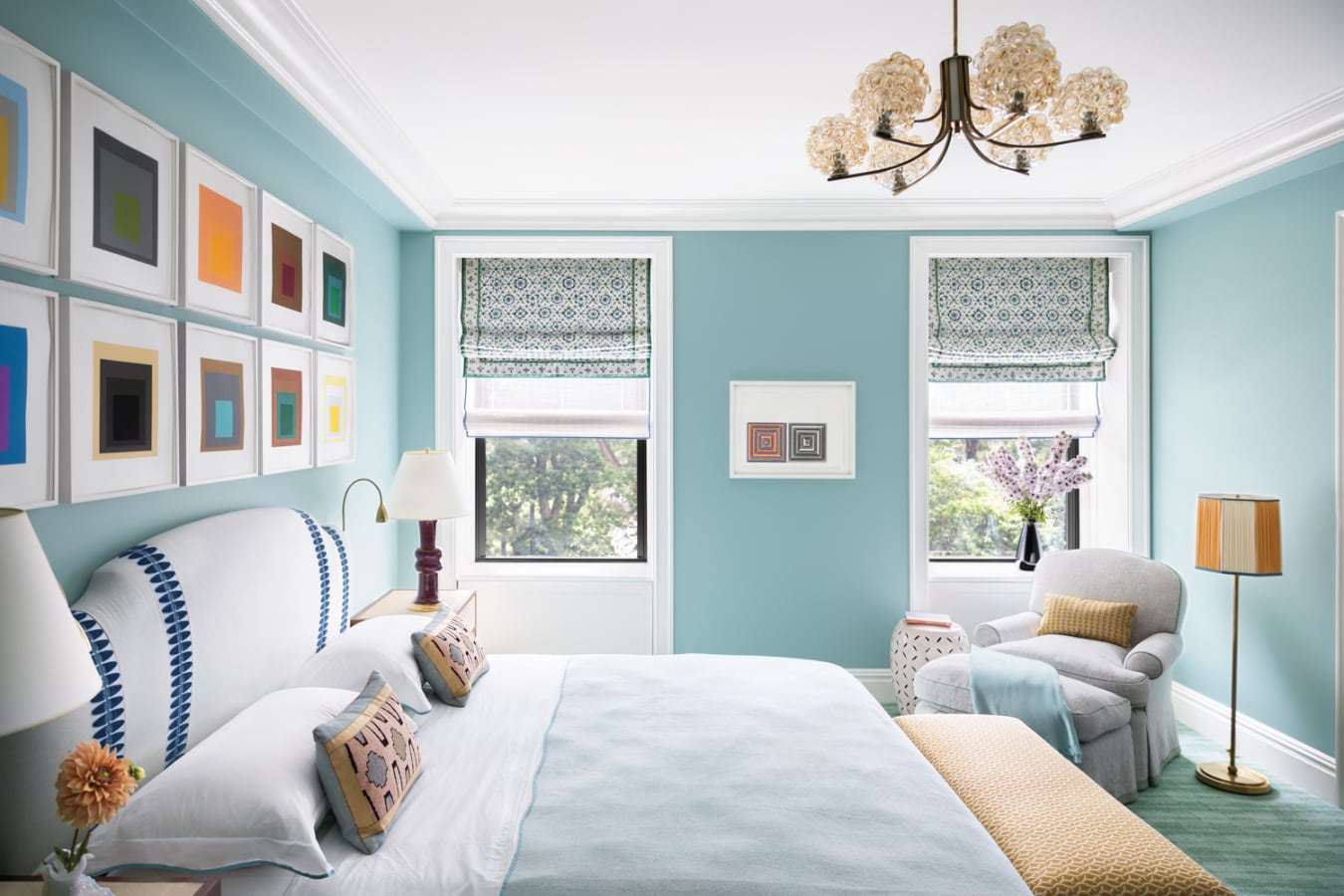 - Functionality: Consider whether you need both treatments to share the functionality equally or whether one can take up the function and the other complement it from a purely aesthetic perspective. Decorative curtains and roman shades can introduce a layer of color, pattern, or texture to the bedroom. For example, single panel, stationary drapes on the sides can frame fully functional, blackout roman shades. And relaxed roman shades or faux roman shades can be outside mounted with zebra blinds or Venetian blinds within the window recess.