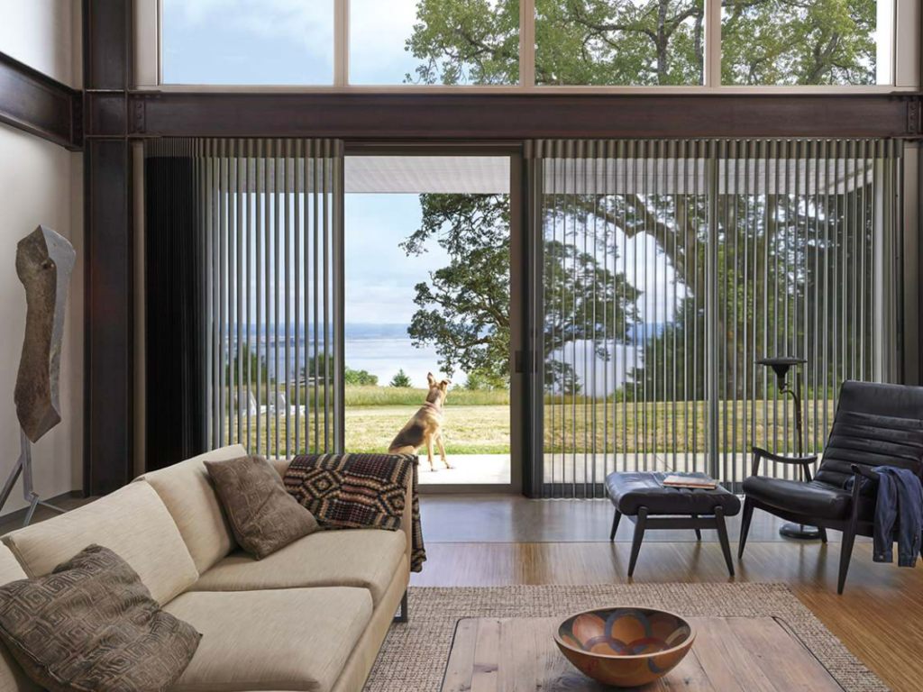 The only downside to installing roller shades on your sliders is that you can’t pass the doors when the shades are down without first clearing them off. It’s true of all top-mounted window solutions. The way out is to install multiple shades instead of one sweeping panel so you can open one for passage while keeping all others closed.
