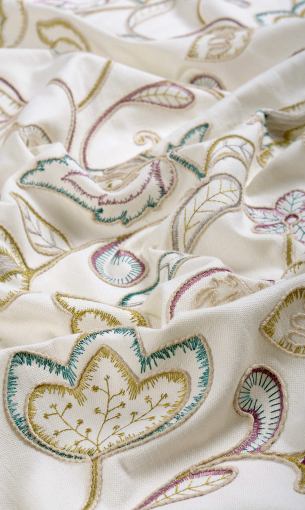 Our semi-sheer Motivo curtains are all about glamor with a fun twist, featuring tiny multi-colored embroidered motifs on a beautiful white linen-like texture. The little tassels stitched into the motifs explicitly celebrate the feminine character of the space while adding to its textural quality.
