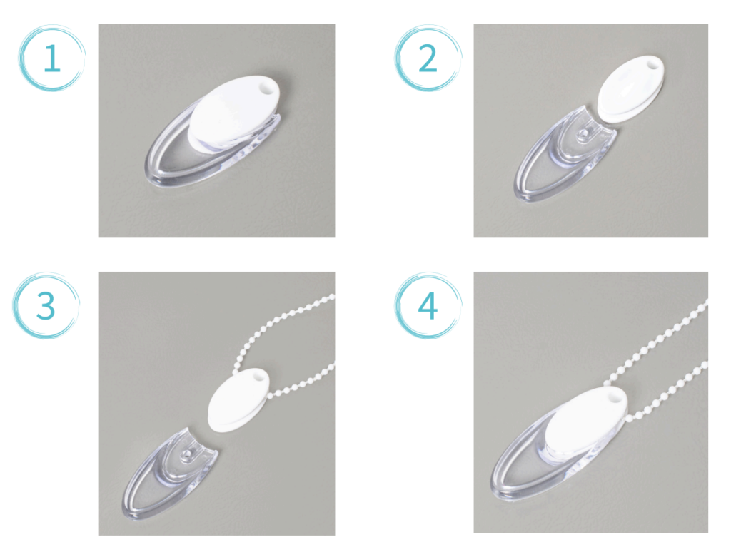 Separate the top white portion of the anchor from the bottom clear one with a gentle twist and pull. Loop the pull cord around the inner groove of the white part. Clasp the two parts of the anchor by pressing the white portion onto the clear part until it clicks into place, as shown in the following video–