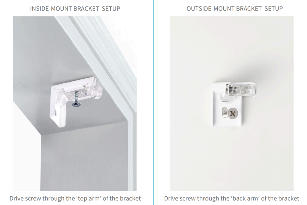 As noted above, you’d need to drive the screw into the ‘top arm’ of the bracket onto the ‘ceiling’ of the window frame for inside-mounted blinds. For outside-mounted roman shades, drive the screw into the ‘back arm’ of the bracket onto the wall above the window trim.
