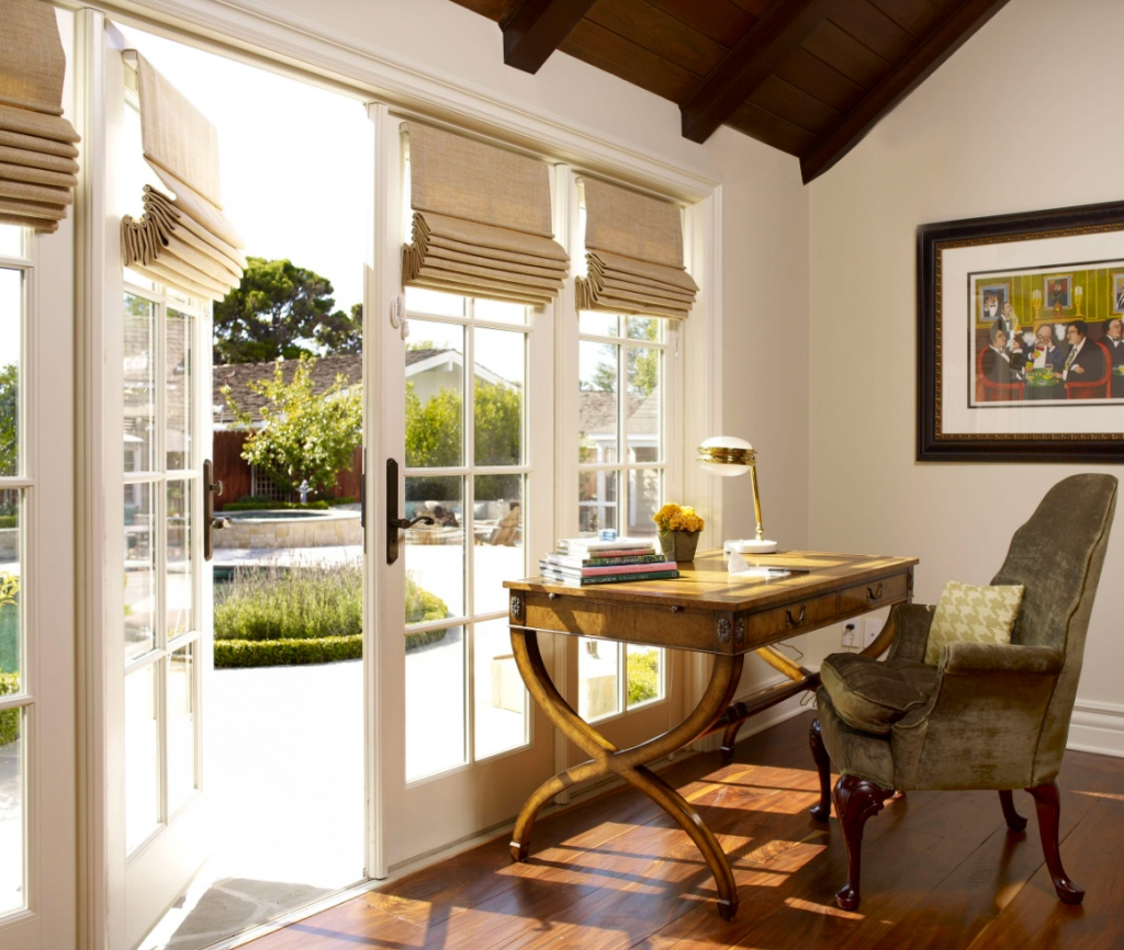 For the love of all things good about fabrics, roman shades are on top of the list. They are single fabric panels that fold in accordion style upward on a cord and loop system. If your patio has multiple doors, installing one shade above each door would be ideal. We love roman shades on patio doors because: